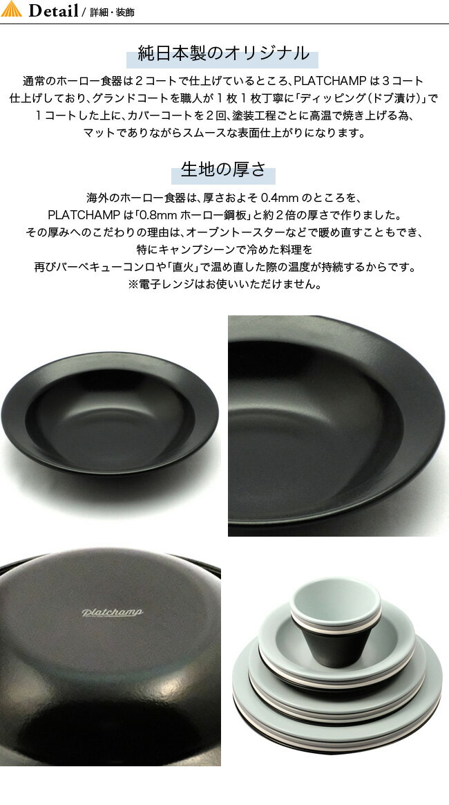 【 SPEC /製品仕様 】■ブランド名:Platchamp■商品名:ディーププレート■商品型番:PC002■カラー:アイボリー,ブラック,グレー,グリーン,ブルー■サイズ:口径21.5cm\高さ4cm■素材:・材料の種類\ほうろう用鋼板(板厚:0.8mm)・表面加工\本体:ホーロー■重量:約320g■生産国:JAPAN■仕様:・電子レンジ使用不可。