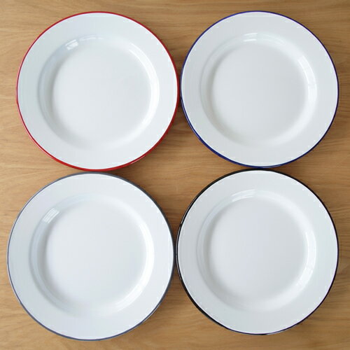 シンプルなデザイン昔ながらの琺瑯プレート 真っ白の琺瑯にカラーの縁取りがアクセントになった 琺瑯プレート。