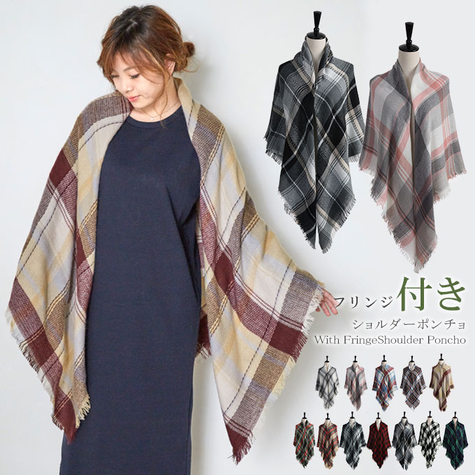 今だけ送料無料 ルック バイ エム LOOK BY Mチェック フリンジ リバーシブル ポンチョ ストールカシミアタッチ 無地 大判ストール 羽織 ショールカーディガン レディース (MSF1210)