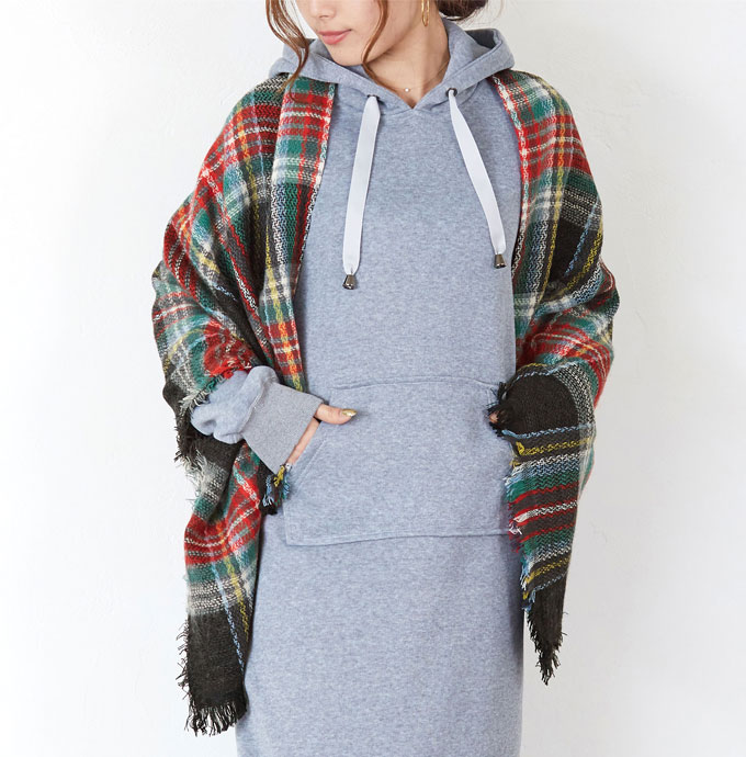 【即納】パーカーチェックポンチョジャケット・フード付大判ストール【メール便は不可商品です】